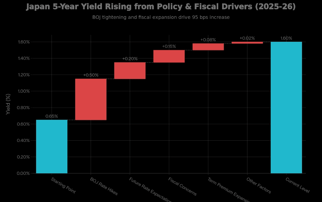 ​The 5-year yield climbed to 1.60%, matching levels last observed in June 2007. Market expectations of further BOJ rate hikes have pushed yields higher across the curve.