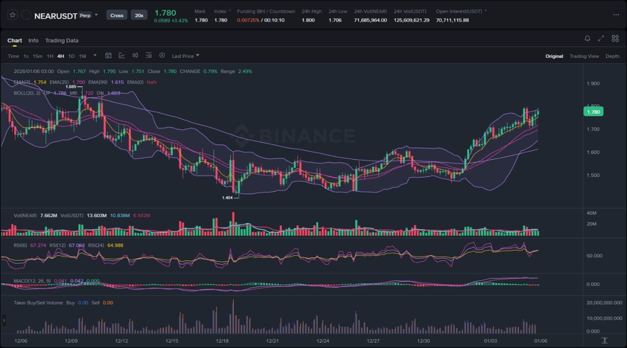 En approfondissant l'analyse du mouvement des prix, la structure de NEAR a évolué d'une tendance baissière à la fin 2025 vers une consolidation en zone comprise entre 1,43 $ et 1,80 $, avec la récente hausse de 20 % testant le sommet de cette zone. Le graphique montre des sommets locaux clairs à 1,80 $ et 1,73 $, où une pression de vente est apparue, mais sans produire de nouveaux plus bas, ce qui suggère une faiblesse des vendeurs et une accumulation croissante d'ordres acheteurs. La pile des EMA reste intacte, avec l'EMA 7 qui s'impose de manière agressive, offrant un soutien dynamique lors des corrections, tandis que l'EMA 99 agit comme filtre de tendance autour de 1,50 $, en dessous duquel l'invalidation devient probable. Les bandes de Bollinger montrent que le prix reste proche de la bande supérieure après le rebond, un signe classique de continuation de la dynamique, mais une contraction près de 1,80 $ suggère une expansion imminente de la volatilité — soit une rupture, soit un rejet. Le RSI, revenu de niveaux de survente inférieurs à 40 à 58, confirme le croisement haussier du MACD, sans divergence, renforçant ainsi une dynamique haussière authentique plutôt qu'un rebond de type « mort-chat ». Au niveau de 0,2029 $ mentionné ? Attendez, cela semble être une mauvaise lecture — le contexte du graphique pointe vers 1,729 $ comme pivot précis, où la liquidité s'est accumulée lors d'une phase antérieure de distribution, maintenant transformée en un point d'entrée à forte conviction sur confirmation de la tendance haussière. Ce setup bénéficie d'un avantage provenant d'une convergence sur plusieurs cadences temporelles : la cadence 4H montre une rupture de canal, le graphique quotidien confirme la reprise de la tendance, réduisant ainsi le risque de faux signaux.