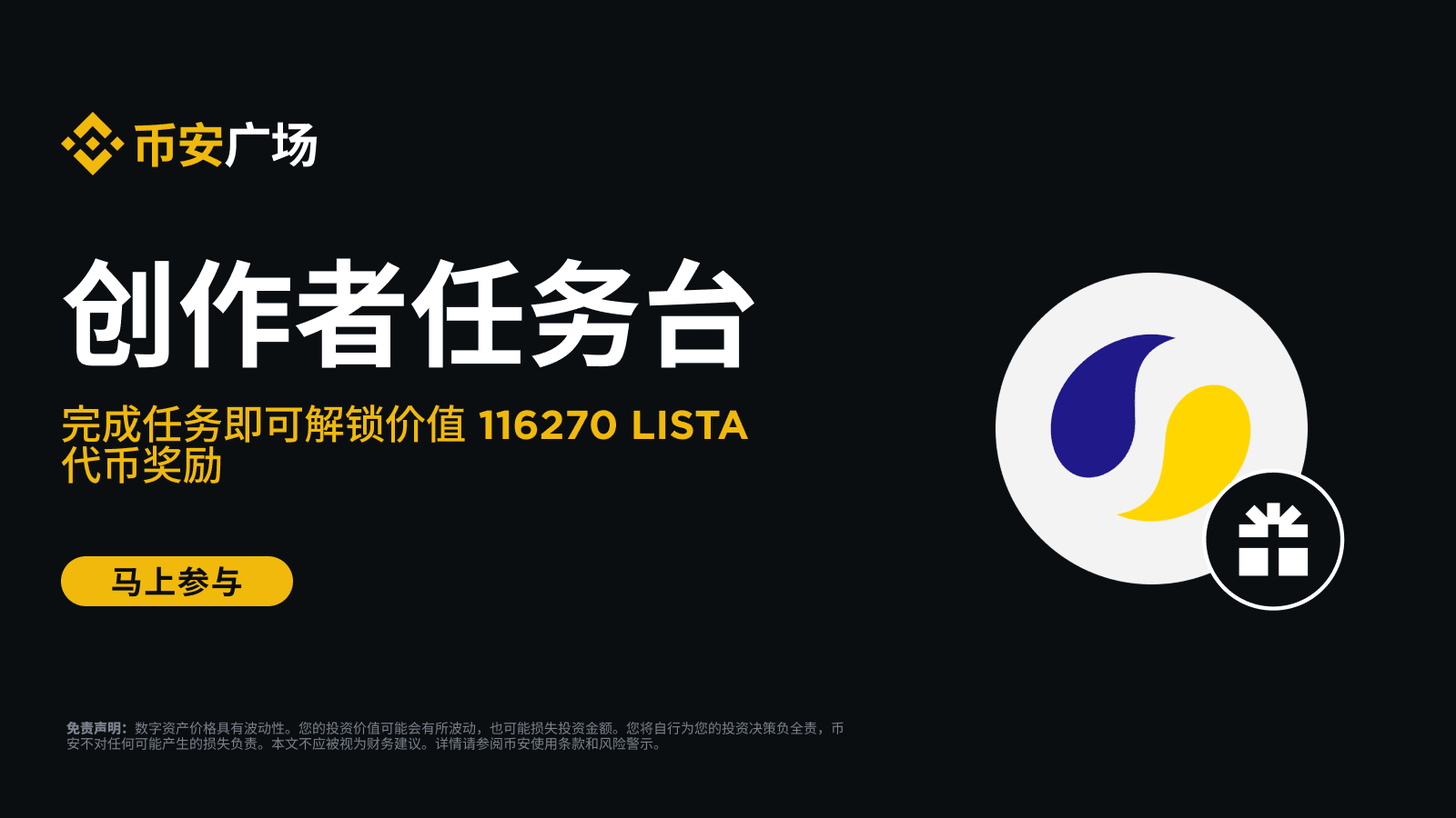 La place de Binance sera bientôt lancéeNouvelle activité sur le tableau de tâches pour créateurs, les utilisateurs ayant réussi la vérification d'identité peuvent débloquer une récompense équivalant à 116270 jetons LISTA après avoir accompli les tâches spécifiées.