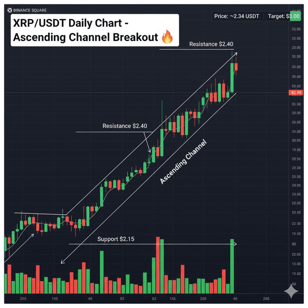 ModÚle : canal ascendant. XRP respecte un corridor ascendant raide, réalisant des sommets et des creux plus élevés avec une symétrie parfaite.