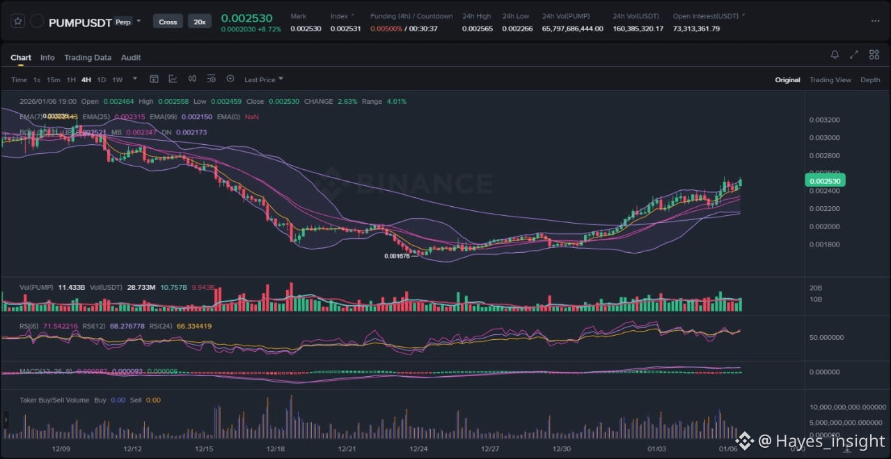 For continuation of the nascent uptrend, PUMP would need to exhibit a decisive breakout above the range top near the recent swing high of 0.0025, accompanied by expanding volume and a bullish MACD crossover to confirm momentum shift. This scenario could unfold if the 7 EMA crosses above the 25 EMA, signaling short-term bullish control, potentially targeting liquidity pockets higher up, with the 99 EMA providing a trailing support in a mean reversion rally. Sustained closes above the middle Bollinger Band would further validate this, drawing in buyers chasing the 2026 hype narrative. Alternatively, invalidation could occur via a breakdown below the range bottom around 0.0018, where a rejection at current supports leads to a fakeout bounce followed by accelerated downside, invalidating the consolidation and resuming the downtrend toward prior lows. This bearish path might be triggered by intensified whale sell-offs or unresolved transfer disputes, with RSI dipping below 30 and MACD histogram expanding negatively to confirm. A fakeout scenario is also plausible, where price teases above resistance only to reverse on low volume, trapping bulls in a liquidity grab before reverting to the range or lower, emphasizing the need for confirmation beyond initial moves.
