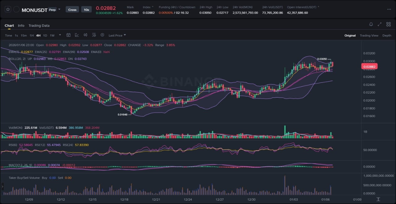 L'examen du graphique en chandelier de 1 heure pour MON/USD révèle que la structure des prix montre une tendance à la hausse claire après une période de consolidation, avec une récente action des prix tentant une rupture d'une plage de plusieurs semaines. Le graphique affiche un mouvement impulsif à la hausse à partir des bas swing locaux près de 0,021 $, caractérisé par des bandes de Bollinger s'élargissant qui indiquent une expansion de la volatilité et un éloignement du comportement précédent de confinement entre 0,020 $ et 0,025 $. Les éléments observables clés incluent un rejet brusque de la bande inférieure de Bollinger le 30 décembre, suivi d'une bougie englobante haussière qui a propulsé les prix vers la bande supérieure, testant maintenant la résistance autour de 0,027 $. L'EMA à 7 périodes a croisé de manière haussière au-dessus de l'EMA à 25 périodes, confirmant le momentum à court terme, tandis que les deux sont positionnés au-dessus de l'EMA à 99 périodes, renforçant la tendance haussière générale depuis fin décembre. Ce tas d'EMA suggère une pression d'achat soutenue, sans signes immédiats de phase de distribution à moins que le prix ne parvienne pas à se maintenir au-dessus de l'EMA à 25.