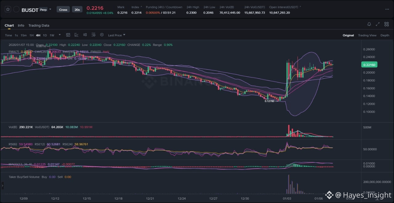 BUILDon's price action reveals an ongoing uptrend structure, characterized by higher highs and higher lows since its recent listing on Binance Alpha, with the token attempting a breakout from a multi-week consolidation range. Observing the chart, key elements include an impulsive upward move from the local swing low around $0.50, followed by a brief consolidation phase near $0.65 that tested support before rejecting lower prices with increased volatility expansion. The exponential moving averages (EMAs) reinforce this bullish bias: the 7-period EMA is sloping upward and positioned above the 25-period EMA, while both remain well above the 99-period EMA, indicating sustained momentum without immediate mean reversion risks. Bollinger Bands show the price hugging the upper band, with a recent squeeze resolving to the upside, pointing to potential for further expansion if volume supports it.