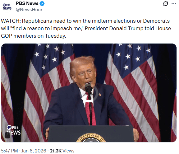 « Vous devez remporter les élections de mi-mandat », a déclaré Trump aux républicains lors d'un discours mardi à la Chambre des représentants. « Si nous ne gagnons pas, ils trouveront tout simplement — franchement — une raison de me destituer. Je serai destitué. »