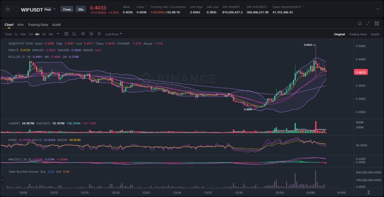 Dans le monde instable des pièces de mode, dogwifhat (WIF) se distingue comme un actif basé sur Solana qui a attiré l'attention des traders grâce à son branding original et à ses fortes fluctuations de prix. En négociant autour de 0,41 $ dans un marché global où le Bitcoin connaît de légères baisses, les mouvements récents de WIF suggèrent un potentiel scénario de poursuite de la hausse ou de retour à des niveaux moyens établis. En tant qu'analyste senior du marché crypto sur Binance Square, cette analyse examine l'évolution du prix du graphique joint, intègre les trois dernières actualités et expose des scénarios probables sans fournir de conseils d'investissement directs. En examinant les indicateurs techniques tels que les EMAs et les bandes de Bollinger, ainsi que l'RSI et le MACD, nous identifions des zones à forte probabilité et des points clés à surveiller pour une observation éclairée.