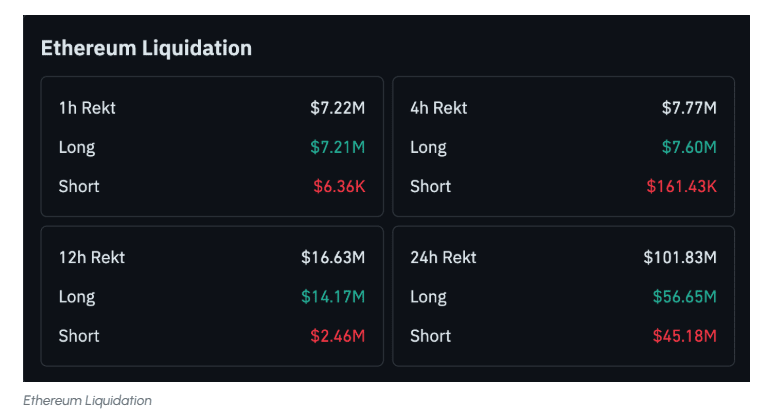 Le marché à terme de l'Ethereum, bien qu'il pénalise les acheteurs, continue de montrer une forte volatilité et un potentiel de mouvements de prix. Au cours des dernières 24 heures, un total de 101,83 millions de dollars en liquidations a été enregistré, dont 56,65 millions de dollars provenant des positions longues et 45,18 millions de dollars des positions courtes.