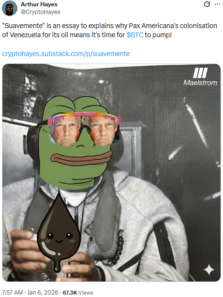 Le cofondateur de BitMEX, Arthur Hayes, a une fois de plus suscité la controverse dans l'ensemble de l'écosystème crypto, arguant que les récents événements géopolitiques entourant le Venezuela pourraient constituer un puissant catalyseur pour une forte hausse du prix du Bitcoin. Selon Hayes, l'intervention des États-Unis et la détention du président Nicolás Maduro ont créé une situation presque idéale pour une nouvelle forte montée des cryptomonnaies.