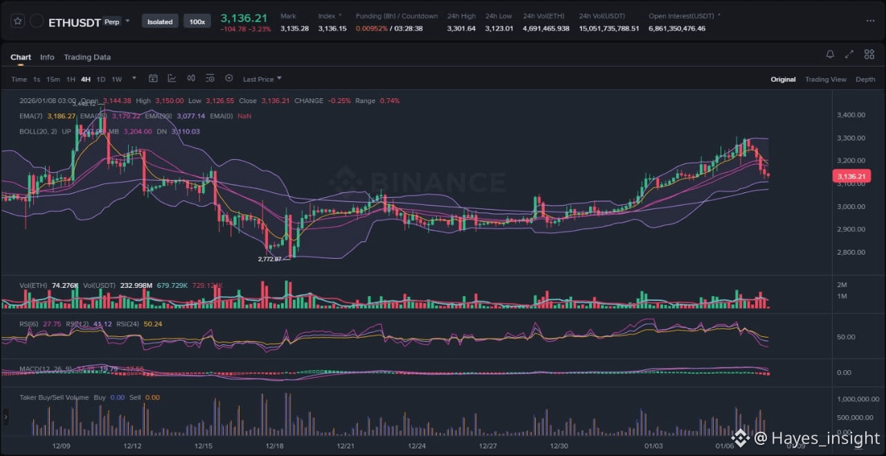 The Ethereum market has exhibited resilient price action over the recent sessions, holding steady around the $3,200 level amid broader crypto sector fluctuations. Drawing from the provided chart, which captures a 4-hour timeframe with candlestick formations, EMAs, Bollinger Bands, RSI, and MACD indicators, the overall structure points to an uptrend attempting consolidation after an impulsive advance. The price has respected the 21-day exponential moving average (EMA) as dynamic support, now flipped bullish following a recent breach and hold above it. Shorter-term EMAs, such as the 7-period and 25-period, are converging bullishly with the 99-period EMA acting as a longer-term anchor, suggesting sustained upward bias rather than a range-bound phase. Bollinger Bands show moderate volatility expansion on the upper band, indicating potential for further extension without immediate overextension. Observable elements include a clear rejection at a local swing high near $3,400, followed by consolidation in a tightening pennant pattern, and an impulsive green candle that swept liquidity below the recent low before rebounding. This setup contrasts with any downtrend signals, as the price remains above all key EMAs, positioning ETH in a corrective uptrend phase rather than distribution.