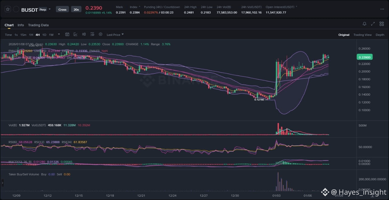 Looking ahead, continuation of B's uptrend would require price to hold above the $0.71 support and push toward the recent swing high, ideally with increasing volume to confirm institutional or retail conviction—failure to do so might signal a fakeout into consolidation. An alternative scenario involves invalidation if price breaks below the 25 EMA near $0.68, potentially leading to a breakdown toward the 99 EMA around $0.60, where deeper liquidity pockets could absorb selling before any rebound. In a fakeout context, a quick rejection from the upper Bollinger Band followed by a liquidity sweep below $0.71 might trap early bulls, prompting a distribution phase, though the current momentum makes this less probable without broader market capitulation.