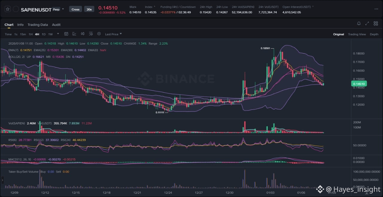 Delving deeper into the technicals, SAPIEN's price action since the Binance listing reveals an impulsive five-wave advance, with the third wave marking the most explosive leg from 0.10 to the recent high near 0.25, characterized by accelerating volume and minimal retracement. Post-breakout, the token entered a brief consolidation phase, forming a tight range between 0.18 and 0.22, where rejection from the upper Bollinger Band signaled continuation potential rather than reversal. The 7 EMA has coiled bullishly around the price, providing intraday support during minor pullbacks, while the 25 EMA's slope steepens, distancing itself from the 99 EMA and confirming the uptrend's health. Bollinger Band squeeze resolution upward aligns with this, as the bands' expansion captures the volatility from news-driven spikes, with the middle band (20 SMA) now acting as a trailing support in the 0.20 area.