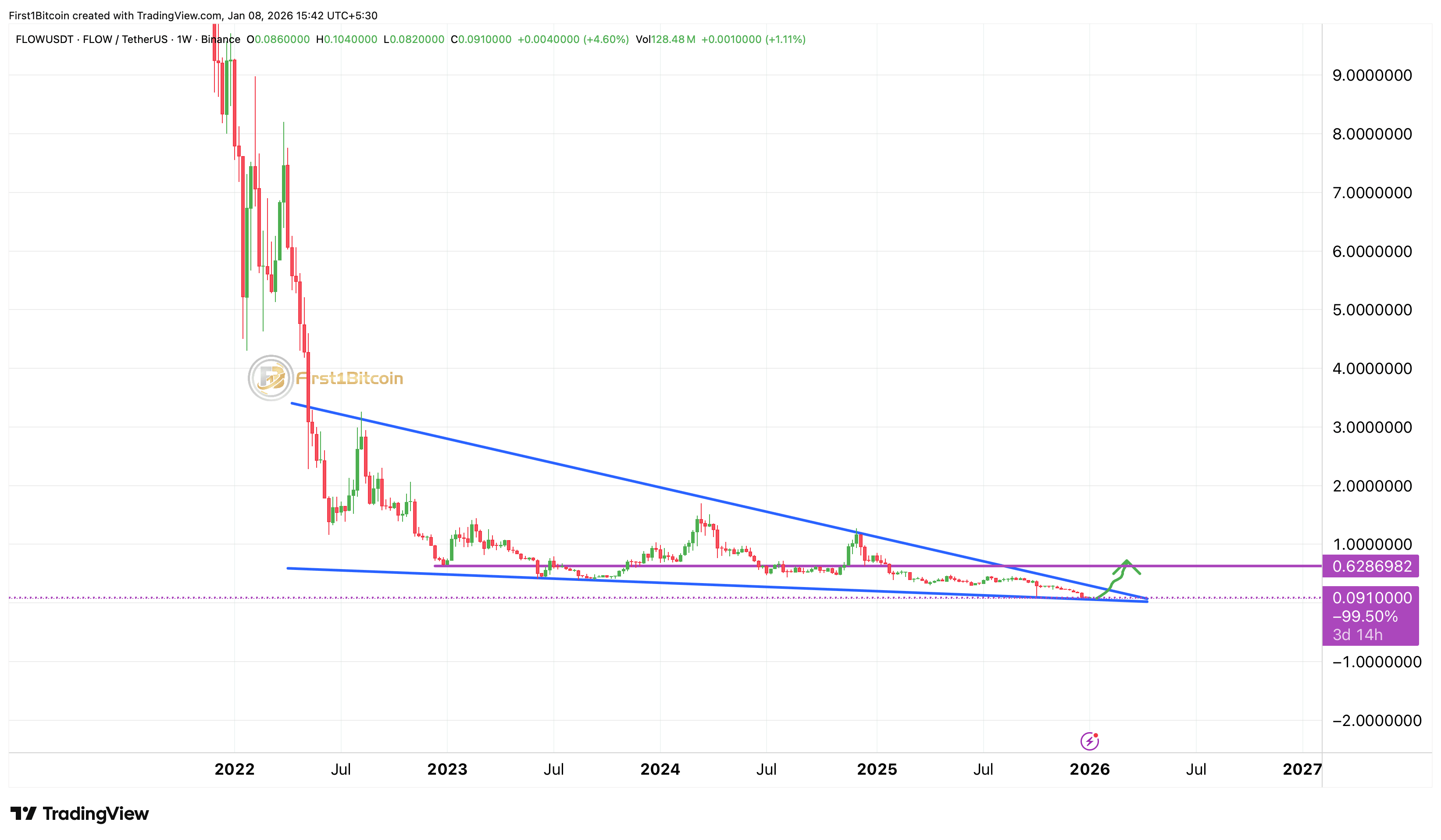 $FLOW has passé des années dans une structure décroissante nette, maintenant en cours de négociation près des creux du cycle avec une volatilité entièrement comprimée.