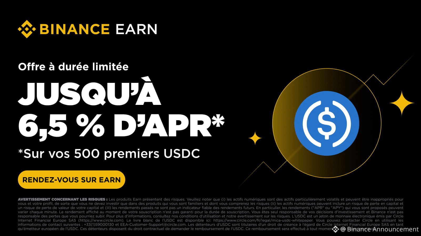 Binance Earn a le plaisir d’annoncer une offre sur les Produits flexibles Simple Earn USDC ! Pendant la période de l’offre, les utilisateurs qui souscrivent aux Produits flexibles USDC peuvent profiter d’un APR allant jusqu’à 6,5 %, incluant des APR bonus à paliers exclusifs en plus des récompenses APR en temps réel.