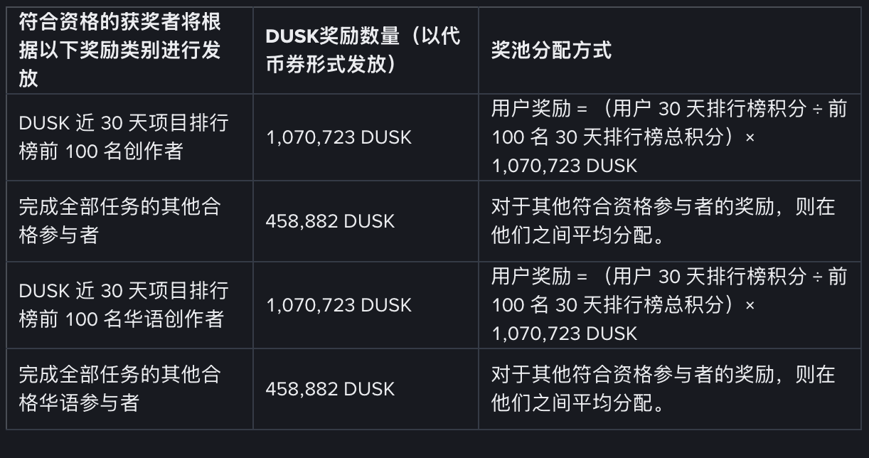 Les utilisateurs éligibles seront classés selon le classement final du dernier mois (30 derniers jours) de DUSK, à la date de fin de l'événement.