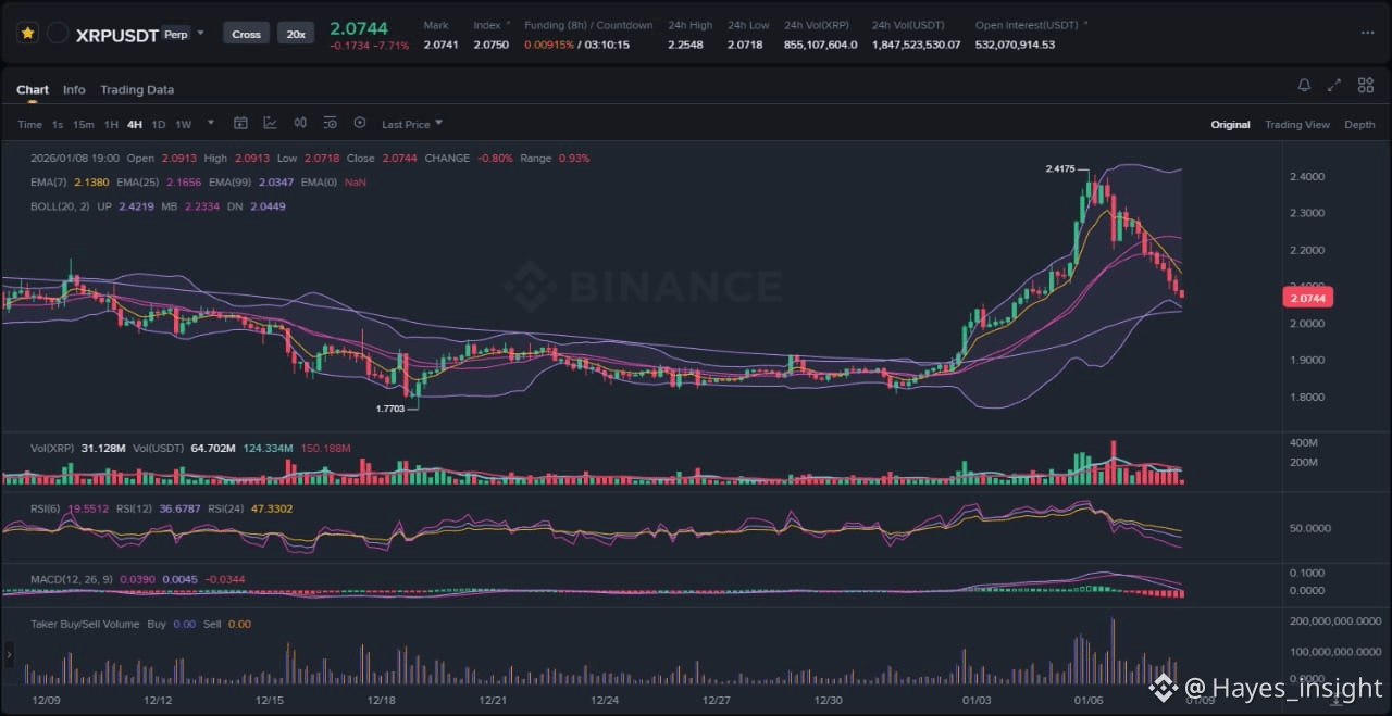 The broader cryptocurrency market entered 2026 with renewed vigor, but XRP's performance has been mixed, outpacing Bitcoin in early-year gains before a swift reversal. Trading at approximately 0.2029 as of the latest data, XRP reflects a downtrend within a broader consolidation phase following its impulsive rally from late 2025 lows. The 7-period EMA sits below the 25-period EMA, confirming short-term bearish momentum, while both are positioned beneath the 99-period EMA, indicating no immediate uptrend resumption. Bollinger Bands have expanded, signaling heightened volatility, with price action hugging the lower band after rejection from the middle band near 0.2350. This setup points to a potential range-bound structure between 0.1950 and 0.2450, where mean reversion could play out if support holds.