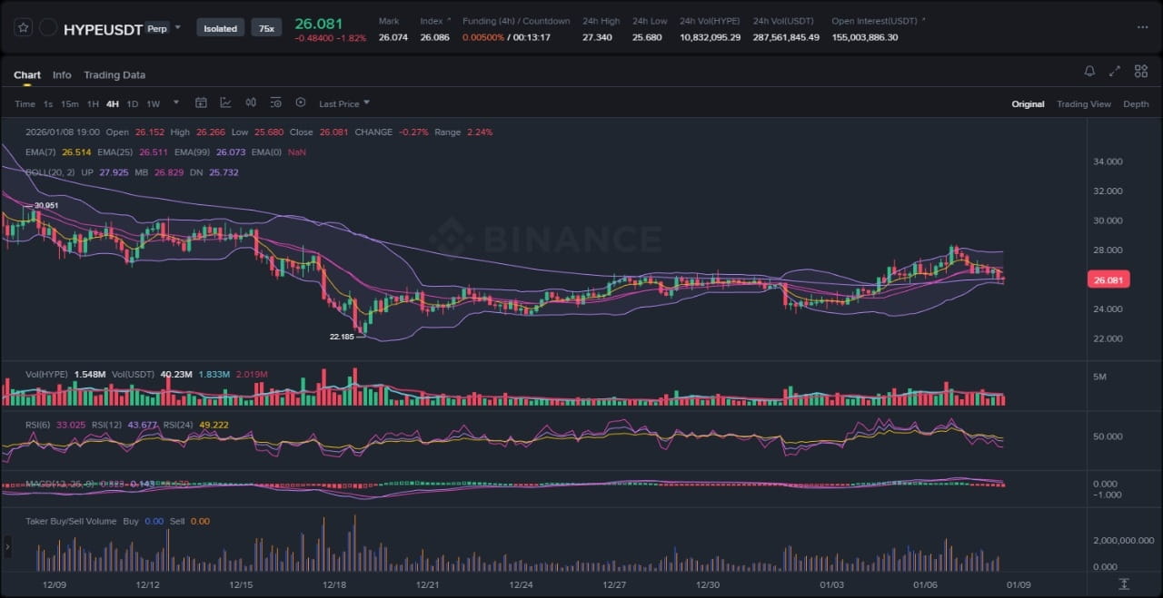 Le marché des cryptomonnaies a commencé la semaine avec optimisme mais a depuis rencontré des pressions de réversion à la moyenne, les actifs majeurs comme Bitcoin chutant à 91 000 $ et Ether se stabilisant à 3 200 $. HYPE, le jeton de gouvernance et d'utilité pour l'échange décentralisé Hyperliquid, reflète ce sentiment plus large mais montre une résilience dans son écosystème de trading de contrats perpétuels. Lancé sur une blockchain compatible EVM propriétaire optimisée pour le trading décentralisé à haute vitesse, Hyperliquid a attiré l'attention pour son exécution à faible latence et son modèle de carnet de commandes innovant, qui contourne les teneurs de marché automatisés traditionnels. Selon les dernières données, HYPE se négocie à environ 29,80 $, en légère baisse par rapport aux récents sommets mais restant au-dessus des moyennes mobiles clés. Ce positionnement suggère un marché en phase de consolidation plutôt qu'une distribution claire, avec des poches de liquidité se formant autour de la zone de support de 28 $. La structure globale reste haussière à moyen terme, soutenue par une activité croissante sur la chaîne et l'adoption par les traders, bien que la volatilité à court terme puisse tester les limites inférieures si le sentiment du marché plus large se dégrade.