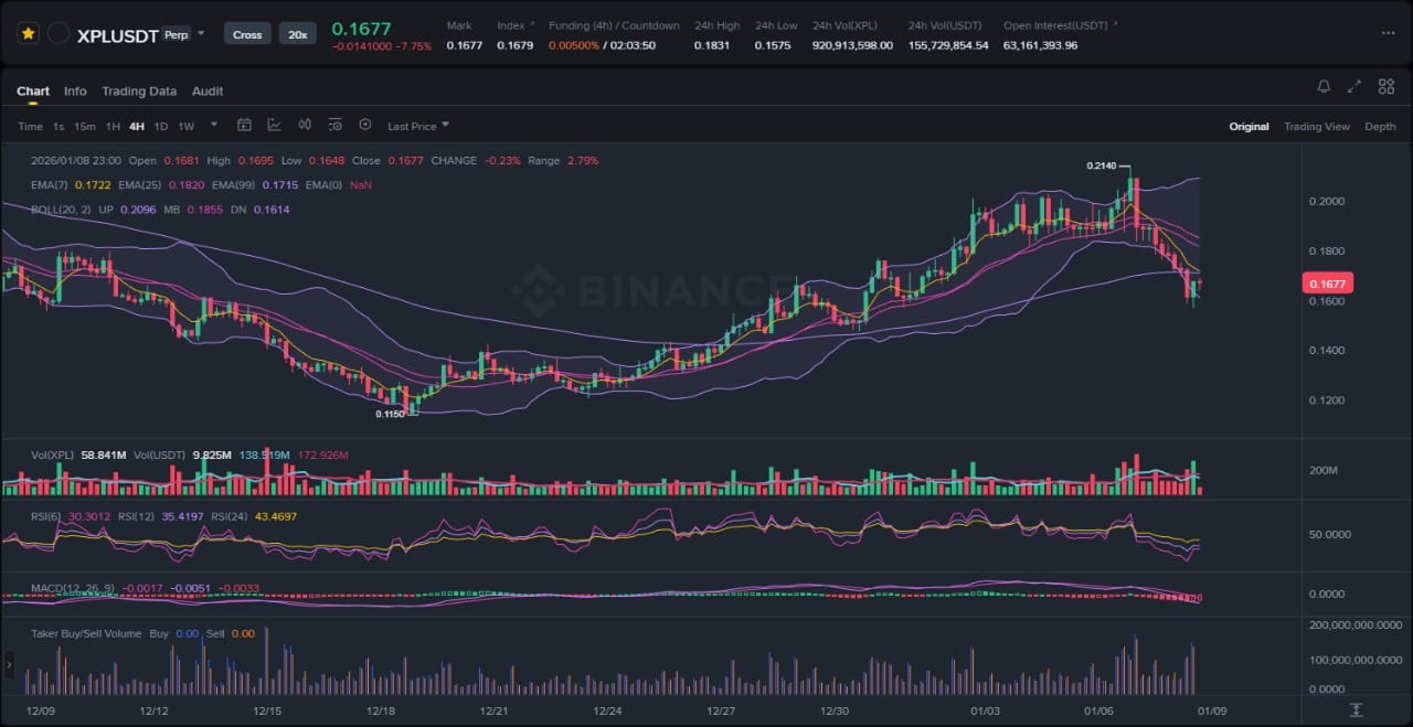 Pour une continuation haussière, XPL doit se maintenir au-dessus du niveau de rupture de 0,17 $, idéalement en formant des creux plus élevés au-dessus de l'EMA de 25 tandis que le volume confirme la conviction des acheteurs, poussant vers l'extension de la bande supérieure de Bollinger et les récents sommets. Un retest de 0,16 $ en tant que support, suivi d'une bougie de rejet avec une croissance de l'histogramme MACD, validerait ce chemin, menant potentiellement à un mouvement mesuré ciblant les extensions de Fibonacci 1,618 à partir du creux récent. Ce scénario gagne en probabilité si la vente liée au déverrouillage est rapidement absorbée, permettant à la tendance haussière de reprendre avec le RSI reculant à 50-60 pour un momentum sain.