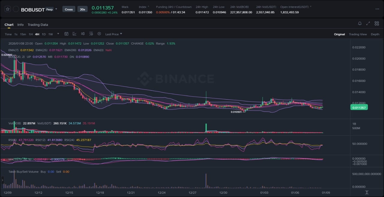 En examinant le graphique fourni sur une échelle de 4 heures, l'évolution du prix de BOB montre une structure claire de tendance haussière suivant un mouvement impulsif depuis des creux locaux près de 0,0008, marquant une tentative de rupture d'une fourchette sur plusieurs mois. Les motifs de bougies montrent une expansion de la volatilité, avec des ombres longues supérieures indiquant un rejet à la résistance initiale autour de 0,0020, suivie d'une consolidation dans une formation de pennon en resserrement. En utilisant des moyennes mobiles exponentielles (EMAs), la moyenne mobile exponentielle à 7 périodes s'incline vers le haut et reste au-dessus de la moyenne mobile exponentielle à 25 périodes, confirmant la tendance haussière, tandis que la moyenne mobile exponentielle à 99 périodes agit comme un soutien dynamique près de 0,0012, empêchant la réversion vers un terrain baissier. Les bandes de Bollinger se sont élargies, avec le prix collé à la bande supérieure, signalant une impulsion soutenue plutôt qu'une surévaluation.