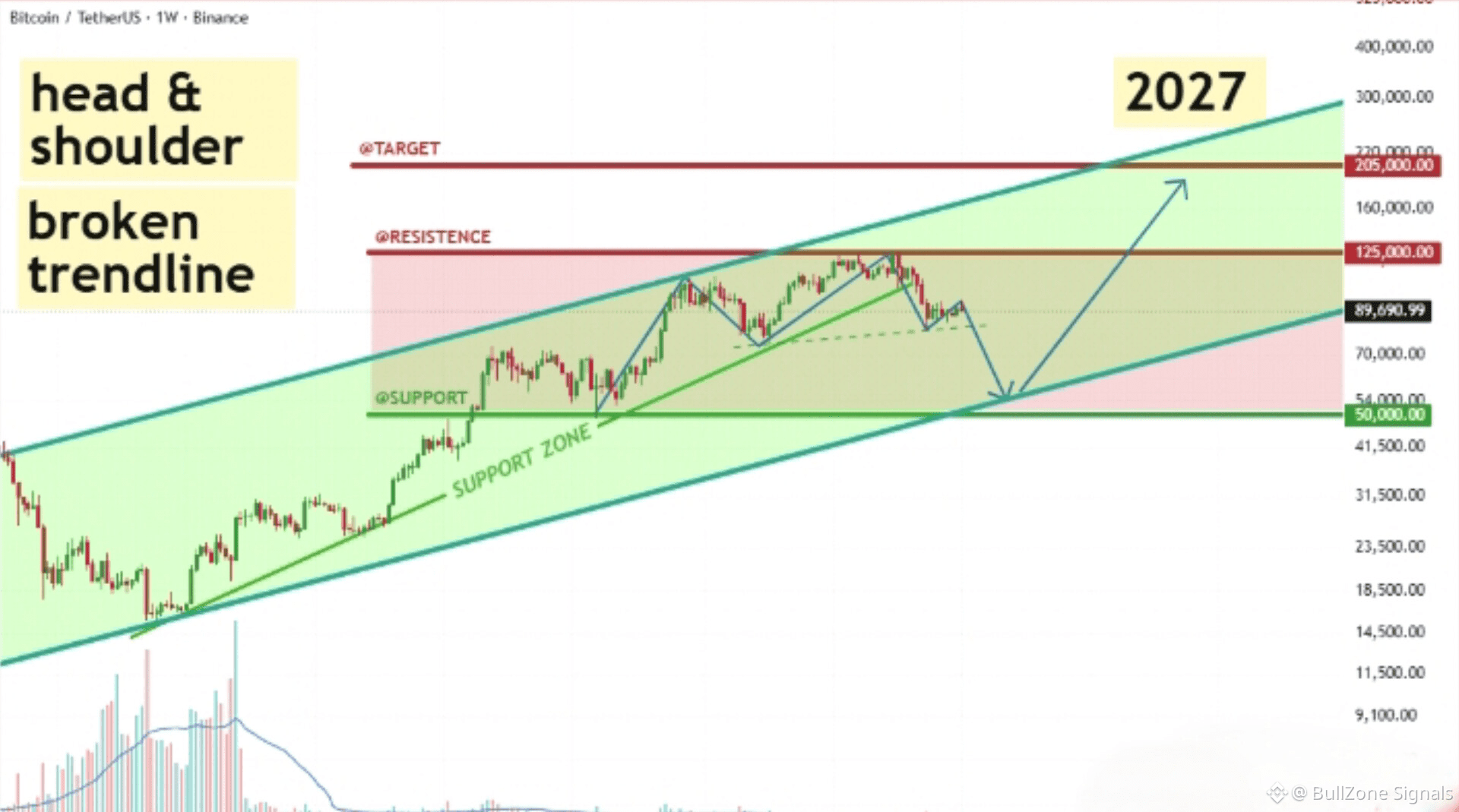 $BTC's weekly chart confirms a major bearish Head & Shoulders pattern and a broken uptrend line. Extreme caution is warranted as a drop to the $50,000 support zone looks highly probable.