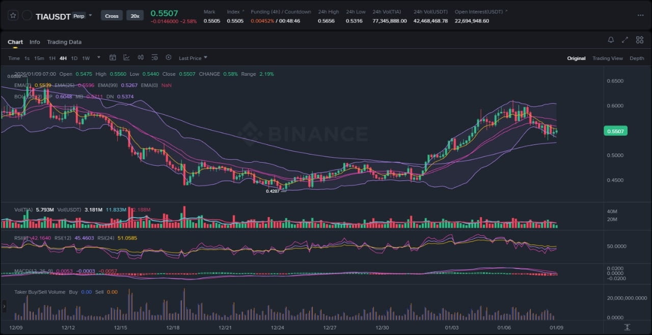 Dans le paysage instable des jetons blockchain modulaires, le TIA de Celestia a été sous pression, les récents développements amplifiant le sentiment baissier et mettant à l'épreuve les supports techniques clés. En tant qu'analyste senior du marché des crypto-monnaies sur Binance Square, cette analyse examine l'évolution récente du prix du TIA, en intégrant les indications du graphique joint avec les trois dernières actualités pour offrir une vision complète des trajectoires potentielles. Les traders évoluant dans ce contexte doivent rester vigilants, car la convergence entre des nouvelles négatives et des ruptures techniques pourrait signaler une baisse supplémentaire, tandis que tout indice de retournement pourrait suggérer des opportunités de réversion vers la moyenne.