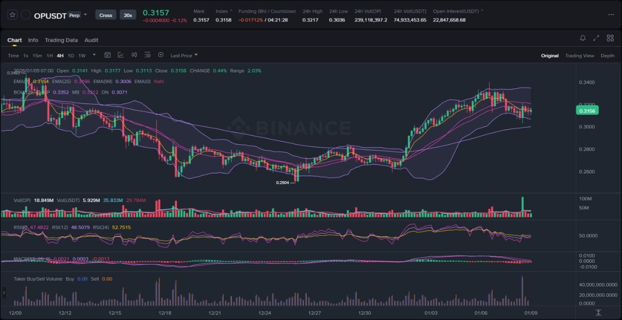 En examinant l'évolution des prix, la structure d'OP révèle une consolidation en fourchette suivant un mouvement impulsif haussier depuis les creux de fin 2025, maintenant en phase de test des limites supérieures d'un modèle de triangle symétrique. Le graphique présente des éléments observables clairs : une phase prolongée de consolidation depuis le milieu de décembre, marquée par une volatilité réduite et des bandes de Bollinger en contraction, suggérant une tentative de rupture imminente ; un rejet aux sommets de swing locaux près de 3,50, indiquant une résistance vendeuse ; et un rebond récent à partir du soutien 2,90, formant un plus bas plus élevé qui suggère une accumulation plutôt qu'une distribution. En utilisant les moyennes mobiles exponentielles (EMAs), l'EMA 7 (actuellement en hausse à 3,02) croise au-dessus de l'EMA 25 (2,98), signalant un momentum haussier à court terme, tandis que les deux restent en dessous de l'EMA 99 (3,15), confirmant que la tendance baissière générale depuis les sommets du quatrième trimestre 2025 s'est arrêtée, mais n'est pas encore complètement inversée. Les bandes de Bollinger, avec le prix collé à la bande moyenne (SMA 20 à 3,04), soulignent cette dynamique de fourchette, où une expansion de la volatilité pourrait propulser les prix vers la bande supérieure à 3,40.