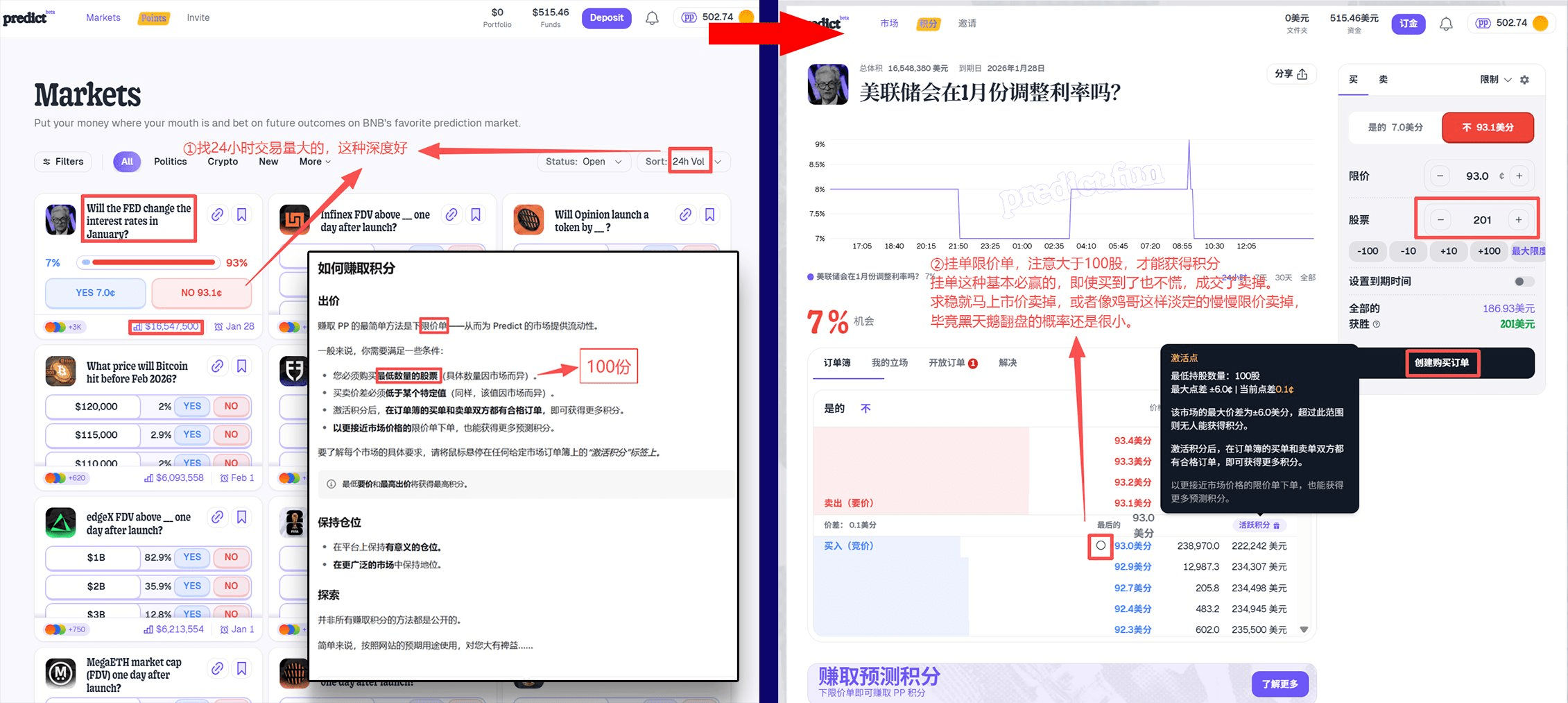 La présentation de predict.fun a déjà été publiée précédemment, voici aujourd'hui une présentation détaillée de la stratégie pour gagner des points. Si vous souhaitez gagner des points sans investir, le point clé est de placer des ordres à prix limité et d'attendre leur exécution.