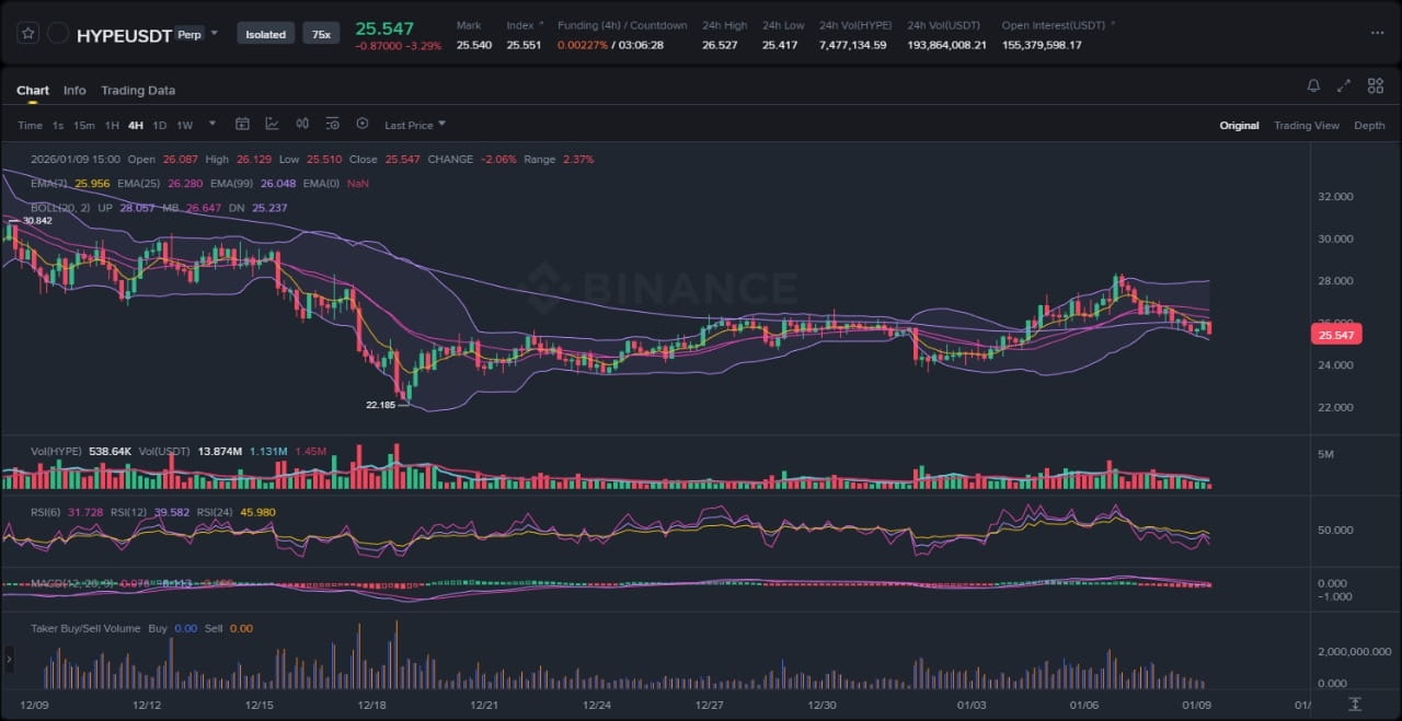 En examinant le graphique joint, HYPE présente une tendance baissière claire, confirmée par la position des moyennes mobiles exponentielles (EMAs) clés. L'EMA à 7 périodes se situe en dessous de l'EMA à 25 périodes, toutes deux orientées vers le bas et bien au-dessus de l'EMA à 99 périodes, qui agit comme support dynamique mais n'a pas été testée récemment. Cette disposition souligne l'orientation baissière, avec l'action du prix coincée dans une zone de compression entre 0,19 $ et 0,25 $, montrant des signes de consolidation après une chute impulsive depuis le sommet local à 0,30 $. Des éléments observables incluent un rejet brutal au sommet de la zone près de 0,25 $, où la volatilité a augmenté brièvement avant de se contracter, ainsi qu'une série de creux inférieurs formés depuis mi-décembre, indiquant une faiblesse croissante de la conviction des acheteurs.