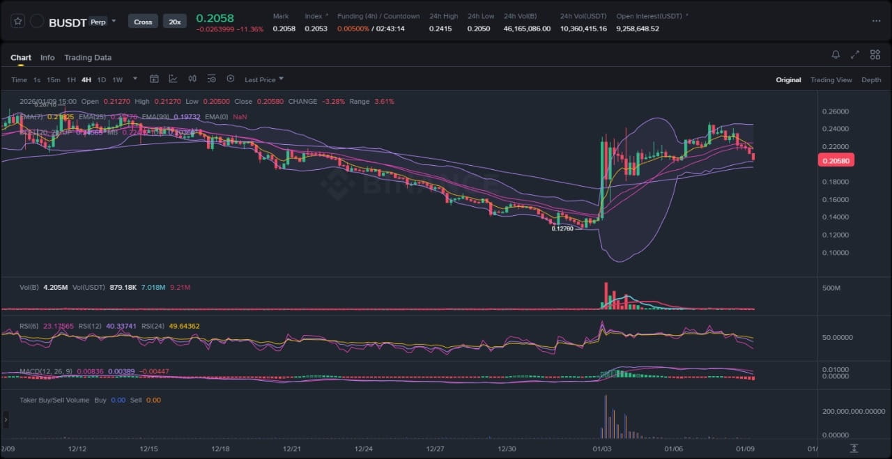 En examinant le graphique fourni, l'action du prix de B révèle une structure de tendance haussière avec une récente tentative de rupture d'une plage de consolidation de plusieurs semaines. Les motifs des chandeliers montrent un mouvement impulsif vers le haut au cours des dernières sessions, caractérisé par des bandes de Bollinger élargies qui signalent une expansion de la volatilité après une période de contraction. Des sommets locaux sont évidents autour de 0,75 $, où une résistance antérieure a été testée et partiellement rejetée, tandis que des creux se maintiennent près de 0,60 $, formant un canal ascendant clair. Les moyennes mobiles exponentielles (EMA) fournissent une confirmation supplémentaire : l'EMA de 7 périodes a croisé de manière haussière au-dessus de l'EMA de 25 périodes, et les deux sont en tendance au-dessus de l'EMA de 99 périodes, renforçant le biais haussier sans signes immédiats de réversion moyenne. Les bandes de Bollinger, le prix se rapprochant de la bande supérieure, suggèrent un élan soutenu plutôt qu'une surextension, bien qu'un recul vers la bande médiane près de 0,68 $ puisse offrir de la liquidité pour la continuation.