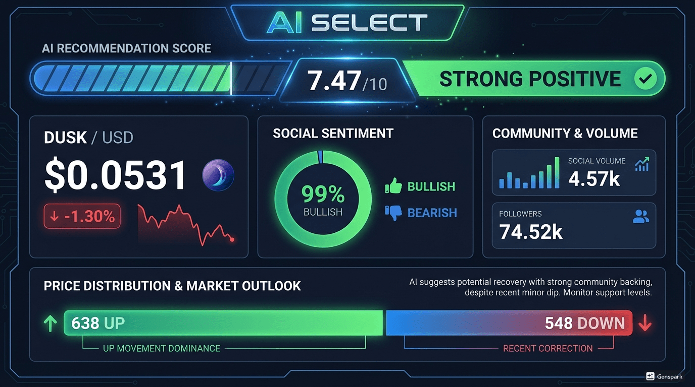 AI Sentiment Score: 7.47/10 - STRONG POSITIVE đ„đ§ Why AI is Bullish on DUSK:đ Privacy Revolution: AI analysis shows overwhelming excitement around DUSK's privacy features and regulatory compliance - a rare combination in today's market!đ Social Metrics That Matter: