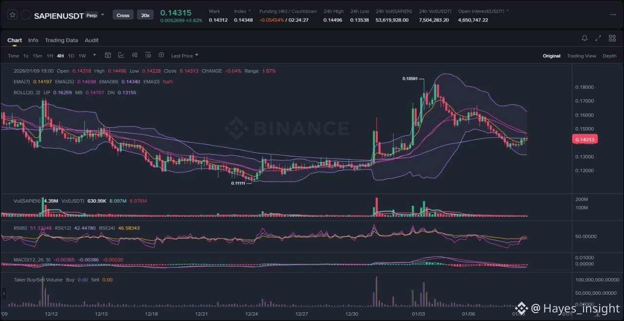 SAPIEN's price chart reveals a robust uptrend following a period of consolidation, with the token trading at approximately 0.2029 USDT on Binance. The overall structure is bullish, characterized by an impulsive upward move that shattered previous resistance levels. Key observable elements include a sharp volatility expansion over the last 24 hours, marked by extended candlesticks pushing beyond the recent swing high around 0.15, and a clear rejection of lower supports during the rally. The Exponential Moving Averages (EMAs) confirm this uptrend: the 7-period EMA is steeply sloping upward and positioned above both the 25-period and 99-period EMAs, indicating sustained buying pressure without signs of mean reversion yet. Bollinger Bands have widened significantly, with the price hugging the upper band, suggesting continued expansion rather than a range-bound phase. This setup points to an ongoing distribution phase potentially giving way to further accumulation if volume sustains. No immediate downtrend is evident, as the price remains well above the 99 EMA, which acts as dynamic support.