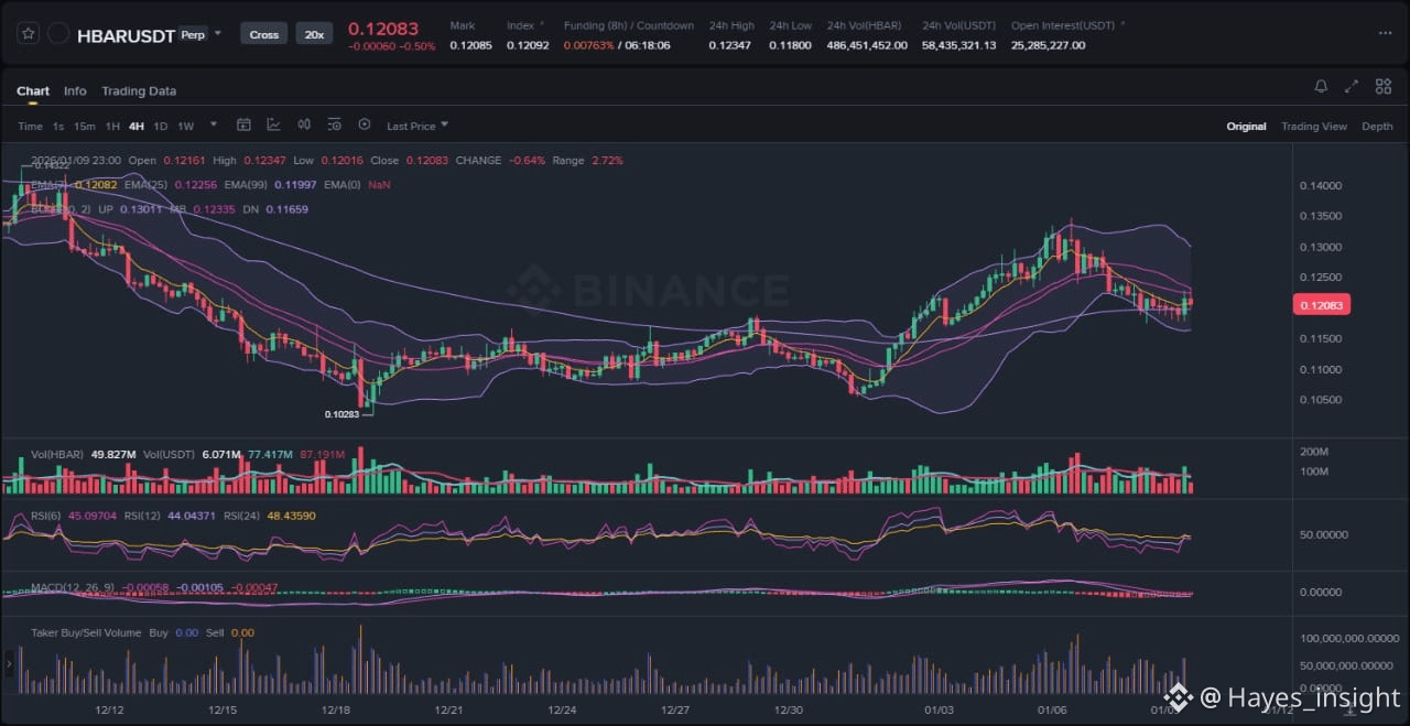 HBAR's price has been navigating a multi-month range following a broader market downtrend that pressured altcoins in late 2025. Currently trading around the 0.1200 level, the asset exhibits signs of a breakout attempt from a descending channel formed since mid-2025 highs near 0.1800. The overall structure leans toward a range-bound consolidation within an overarching downtrend, as evidenced by the price oscillating between local swing lows near 0.1100 and swing highs at 0.1300 over the past few weeks. Exponential Moving Averages (EMAs) provide further clarity: the 7-period EMA hugs the price closely, indicating short-term bullish momentum, while the 25-period EMA acts as dynamic resistance just above the current level, and the 99-period EMA slopes downward, confirming the dominant bearish bias on higher timeframes. Bollinger Bands reveal a contraction phase, with the price testing the lower band after a brief volatility expansion in early January 2026, suggesting potential mean reversion if buying pressure builds. Observable elements include an impulsive upward move from the recent low at 0.1120, followed by consolidation in a tight flag pattern and a rejection at the 0.1250 local high, where selling volume spiked. This setup positions HBAR in a tentative uptrend within the range, but sustained closes above the 25 EMA would be needed to validate a broader reversal.