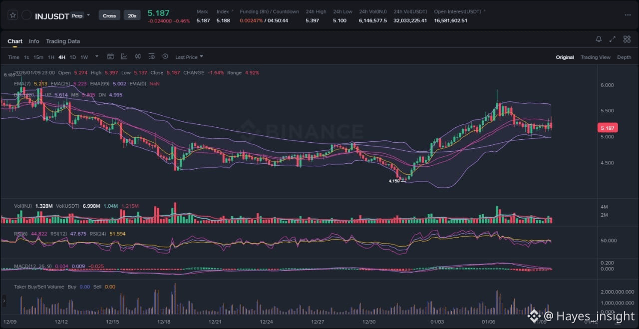 Examining the attached chart, INJ's price structure exhibits an uptrend attempt following a multi-week consolidation phase, with the token breaking above the 25-period EMA at $5.20 to reach $5.44. The chart displays an impulsive move from the local swing low of $4.50 established in late December, characterized by widening Bollinger Bands that signal volatility expansion and potential for further upside. Observable elements include a clear rejection at the upper Bollinger Band near $5.50, followed by a pullback to the 7-period EMA, which now acts as dynamic support, and a series of higher lows forming since the $4.80 level, indicative of building bullish momentum. The 99-period EMA slopes gently upward, confirming the broader uptrend, while the price trades above both the 7 and 25 EMAs, reinforcing buyer control. No immediate range is evident; instead, this appears as a breakout attempt from the prior $4.80-$5.20 channel, with volume spikes accompanying the push through $5.30, suggesting institutional accumulation.