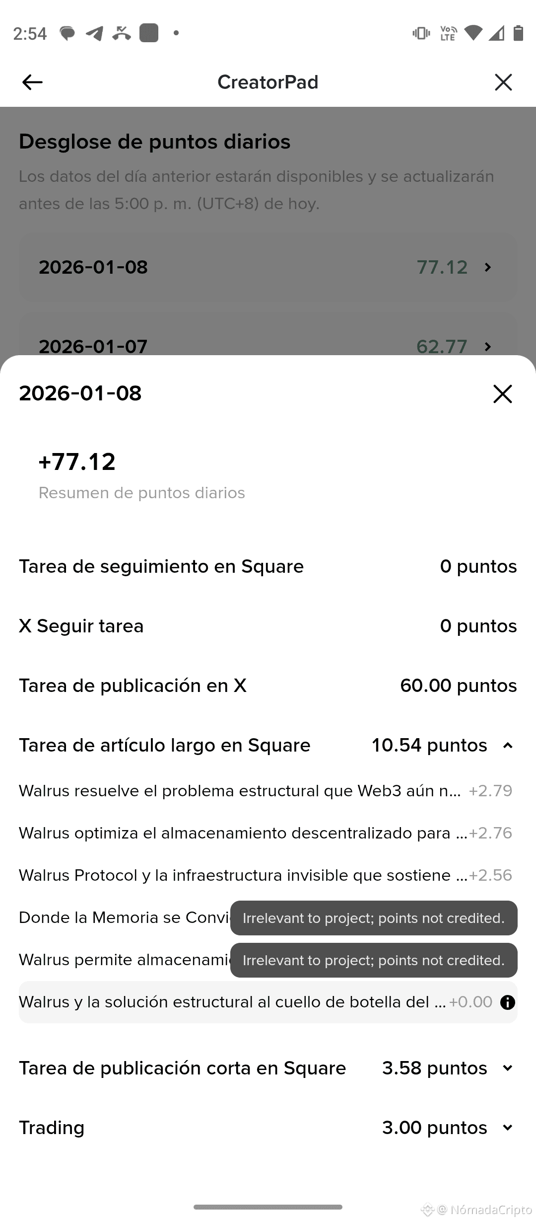 El punto crítico llega cuando miramos la tarea de artículo largo en Square. Aquí Binance no te da un número plano, sino que muestra cada artículo individual con su contribución específica. En esta imagen se ve algo que muchos creadores experimentan pero pocos entienden bien: de seis artículos publicados, solo algunos sumaron puntos parciales, mientras que otros aparecen con mensajes como “Irrelevant to project; points not credited”. Y ahí es donde nace la duda legítima: si todos hablan del mismo proyecto, ¿por qué unos cuentan y otros no?