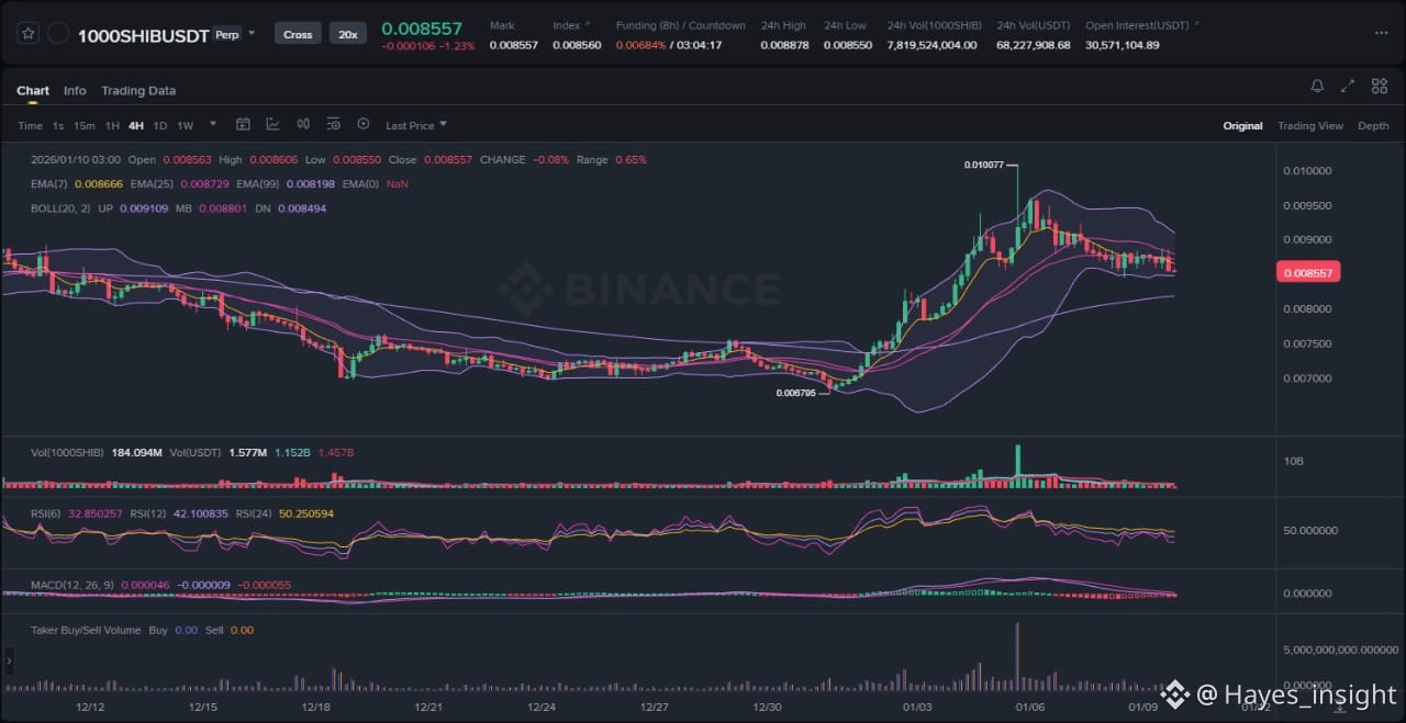 As a senior crypto market analyst on Binance Square, I've dissected countless charts to uncover probabilistic edges in volatile assets like 1000SHIB. With no fresh news breaking through the digest today, the spotlight falls squarely on technical structure, where price action reveals a consolidating pattern that could signal either mean reversion toward equilibrium or a prelude to volatility expansion. This analysis dives into the chart's nuances, blending price structure with indicator confluence, while outlining scenarios that traders might monitor for directional clarity in a market often driven by liquidity pockets and institutional flows.