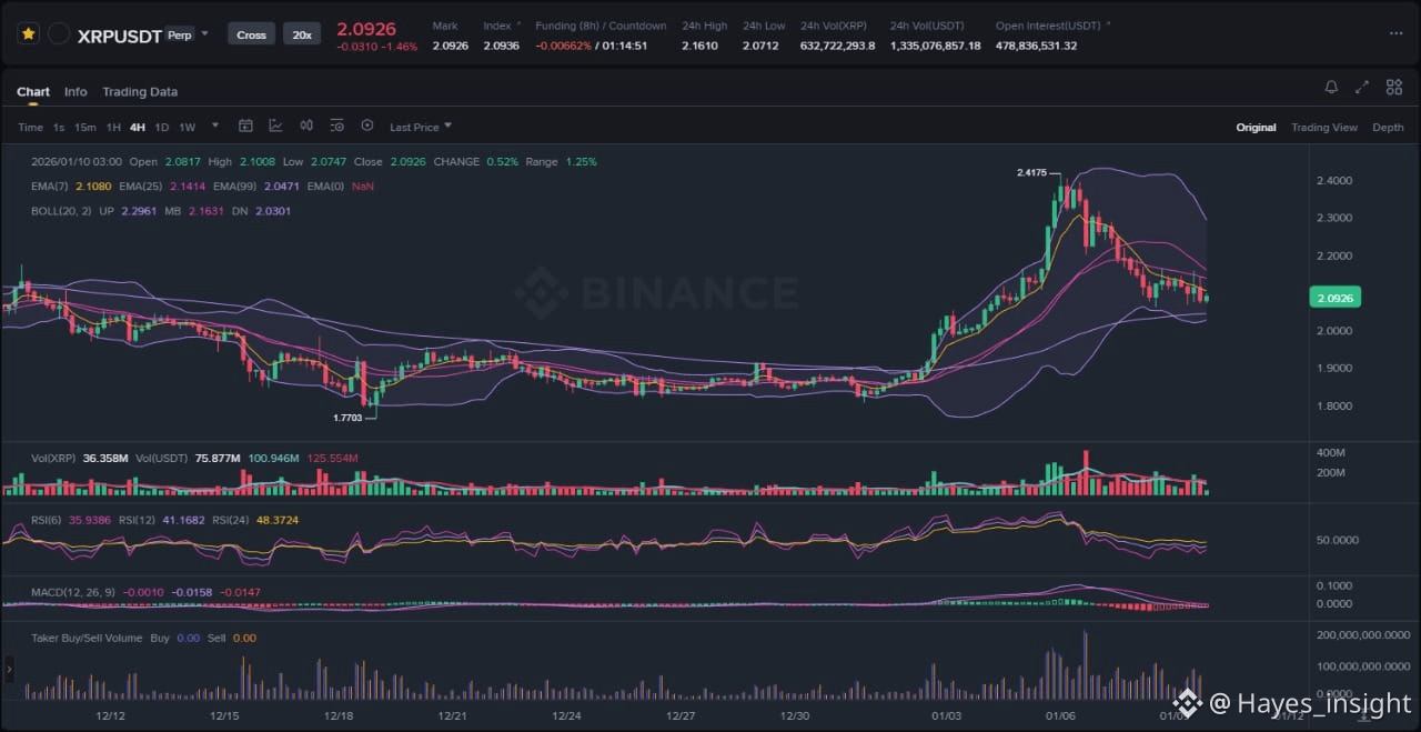 Employing exponential moving averages (EMAs) for trend assessment, the 7-period EMA ($2.08) has crossed above the 25-period EMA ($2.05), forming a nascent golden cross that supports bullish mean reversion potential, while both remain above the 99-period EMA ($1.92), confirming the overarching uptrend integrity. Bollinger Bands further illustrate this setup, with the price hugging the lower band amid contracting bandwidth, signaling reduced volatility and a likely squeeze toward expansion. This positions XRP in a range with upside bias, as the bands' middle line at $2.25 acts as a dynamic resistance-turned-support in prior swings.