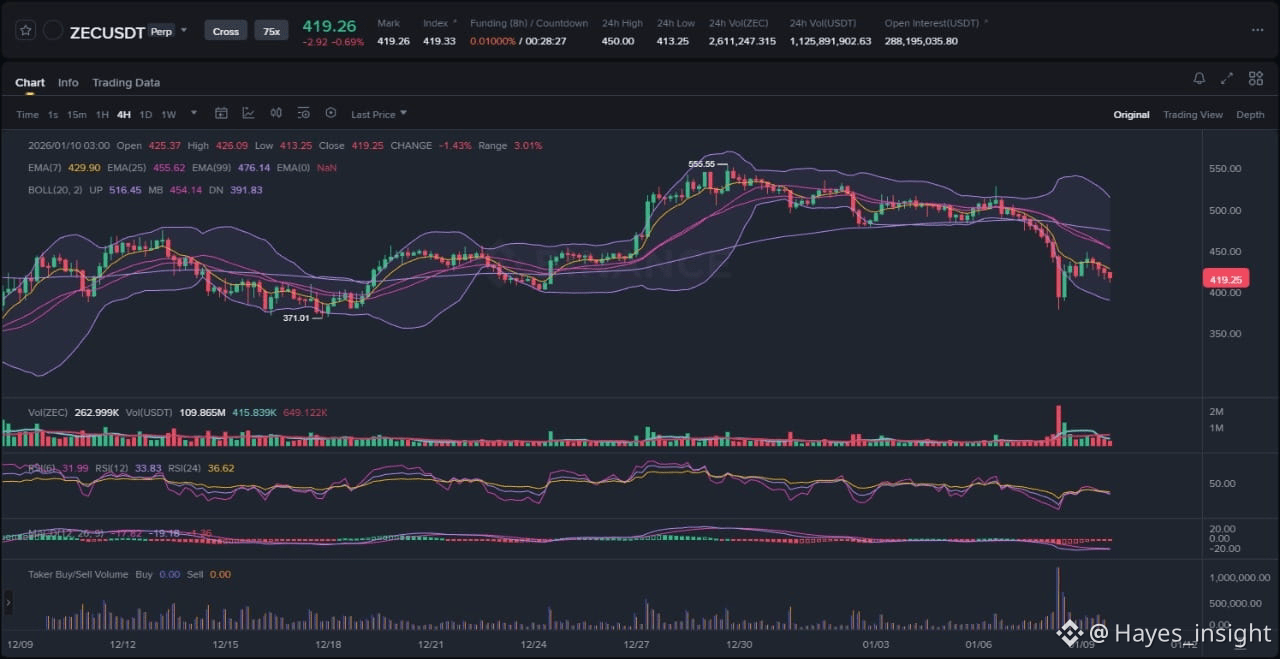 The broader cryptocurrency market remains in a consolidation phase following Bitcoin's recent volatility, with altcoins like ZEC experiencing amplified swings due to their smaller market caps and niche appeal. ZEC, known for its zk-SNARKs privacy protocol, has underperformed relative to majors, dropping over 20% in the past 24 hours amid governance-related shocks. Trading volume has spiked, indicating heightened participation, but liquidity pockets around key support levels suggest potential for a liquidity sweep before any sustained move. The overall market cap for privacy coins has held steady, but ZEC's share has eroded, pointing to sector-specific headwinds rather than a universal altcoin dump.