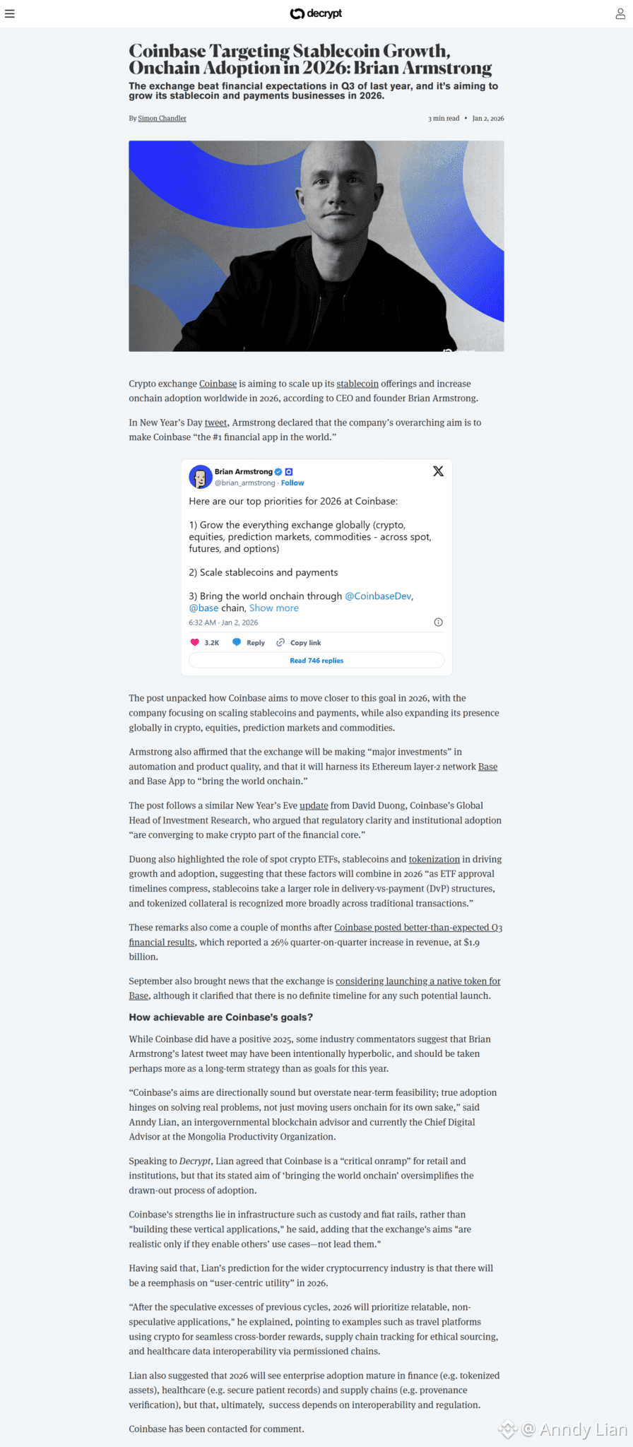 La publication de Coinbase vise la croissance des monnaies stables et l'adoption sur la chaîne en 2026 : Brian Armstrong est apparu en premier sur Anndy Lian par Anndy Lian.