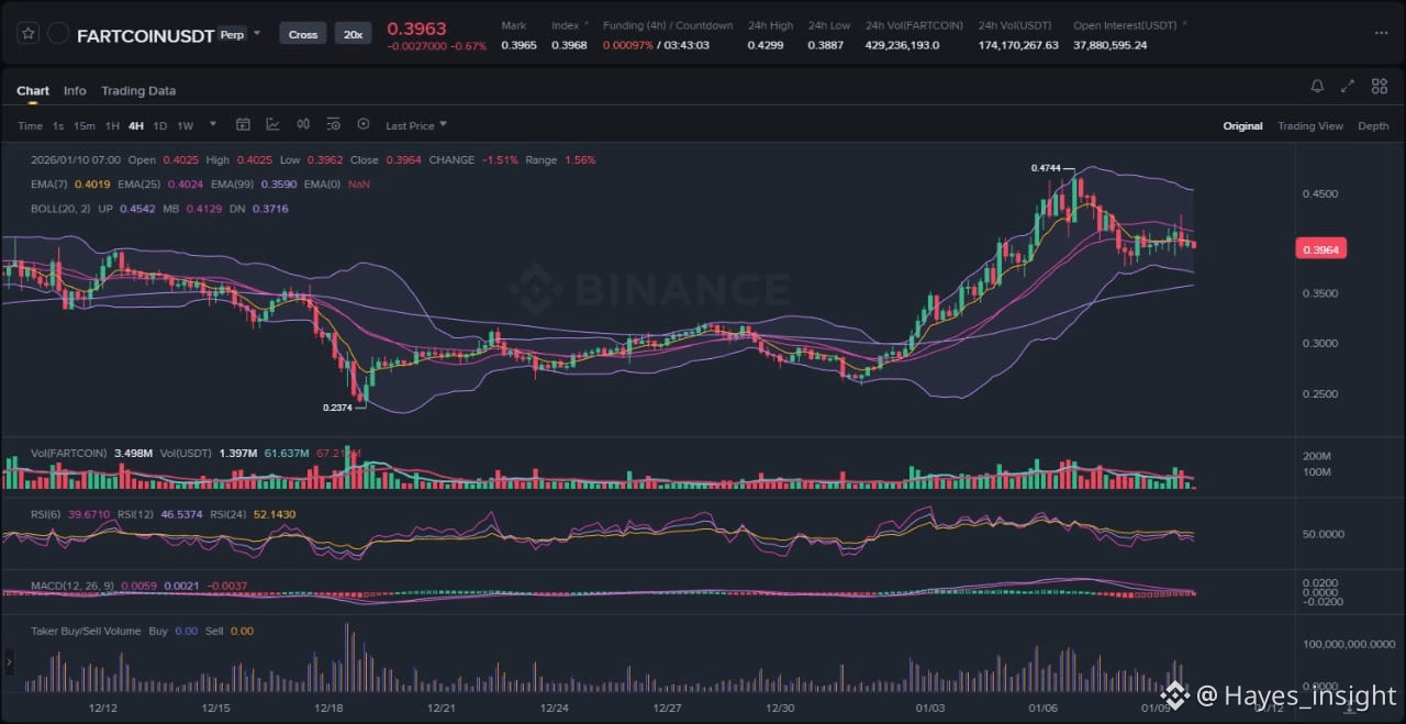 The uptrend's resilience is evident in how price has respected the rising 99 EMA as a long-term floor, while short-term pullbacks have found buyers at the 7 EMA, reinforcing the bullish bias. However, the Bollinger Band squeeze resolution upward doesn't guarantee perpetuity; historical patterns in memecoins like FARTCOIN often see fakeouts during volatility spikes, especially if volume fails to sustain. Rejection at the recent swing high could indicate distribution phase entry, where early participants offload into retail FOMO. Overall, the chart's structure favors continuation if support holds, but traders must monitor for any shift to a range-bound scenario, where price oscillates between the EMAs without clear direction.