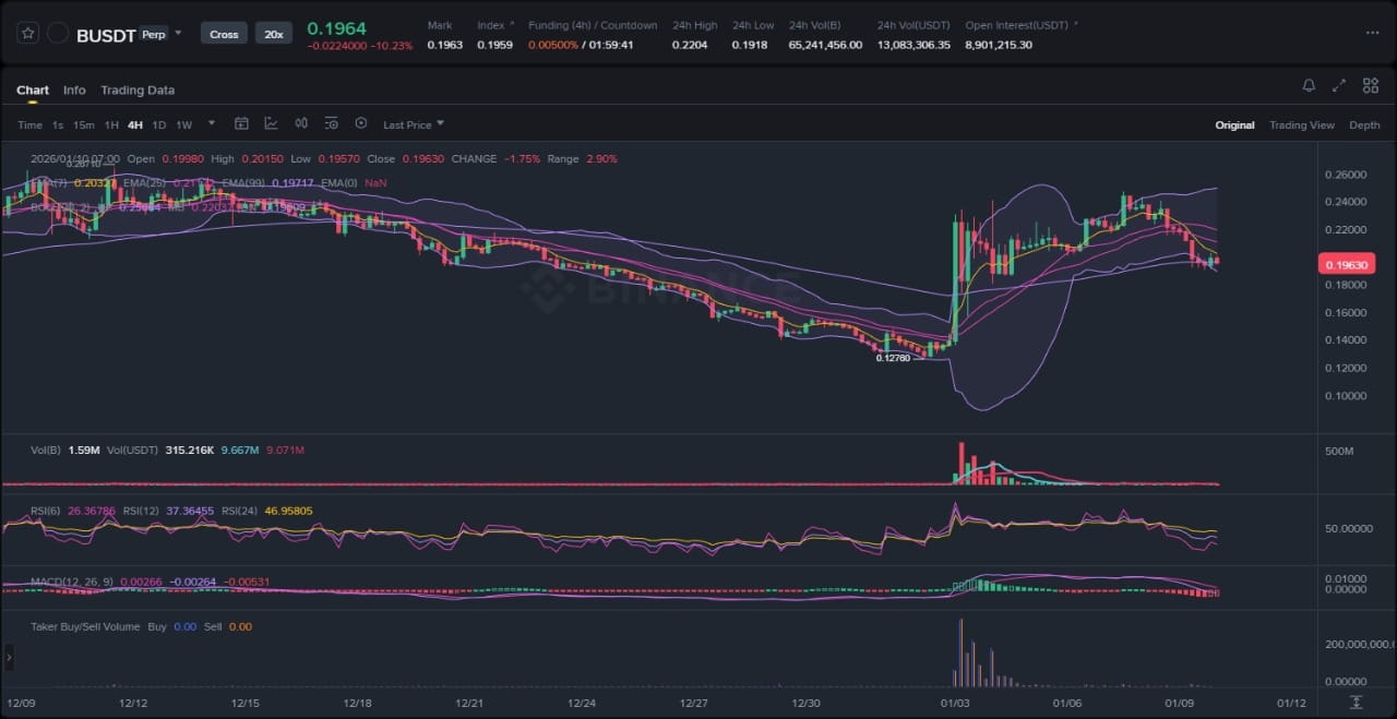 Dans un scénario alternatif d'invalidation, une rupture pourrait survenir si le prix rejette la EMA à 25 périodes et dépasse la liquidité en dessous du fond de la plage près de 0,65 $, invalidant ainsi la structure de la tendance haussière. Cela pourrait se manifester par un faux mouvement, où une hausse initiale attire les acheteurs avant un retournement brutal, déclenché par une baisse de volume ou une capitulation du marché global. Un tel mouvement signalerait un retour à un trading en plage ou une reprise de la tendance baissière, avec la EMA à 99 périodes agissant comme prochain support. Les probabilités favorisent la poursuite étant donné l'alignement des nouvelles, mais une inability à reprendre la bande supérieure de Bollinger pourrait provoquer un déclenchement de liquidité vers le bas, testant des supports plus profonds.