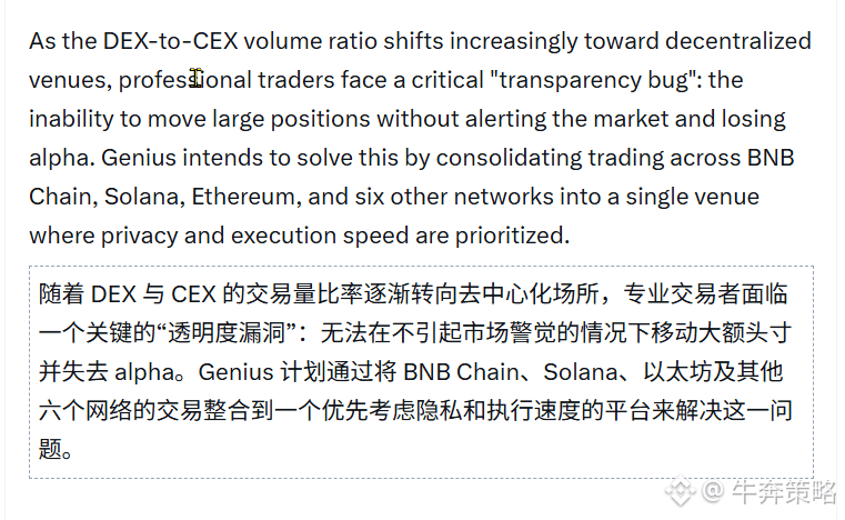 (2)Genius 的位置并不是做市场或发资产,而是补上 DeFi 世界中长期缺失的那一层——执行隐私与专业级交易能力。CZ 作为顾问,更多体现的是对这一演进方向的认可。