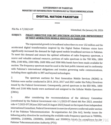The Government of Pakistan has issued a policy directive for the upcoming auction of radio frequency spectrum aimed at enhancing next-generation mobile services. This directive, which follows the country’s broader digital transformation strategy, outlines the auction process for key frequency bands, including 700 MHz, 1800 MHz, 2100 MHz, 2300 MHz, 2600 MHz, and 3500 MHz.