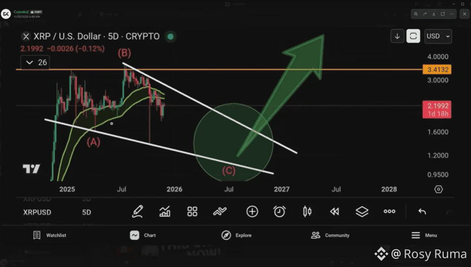 According to the CoinsKid analysis, XRP turned bearish after losing the key $1.90 support level, which confirmed a breakdown in market structure. He believes XRP is now moving through a macro ABC correction, with the C-wave still in progress.