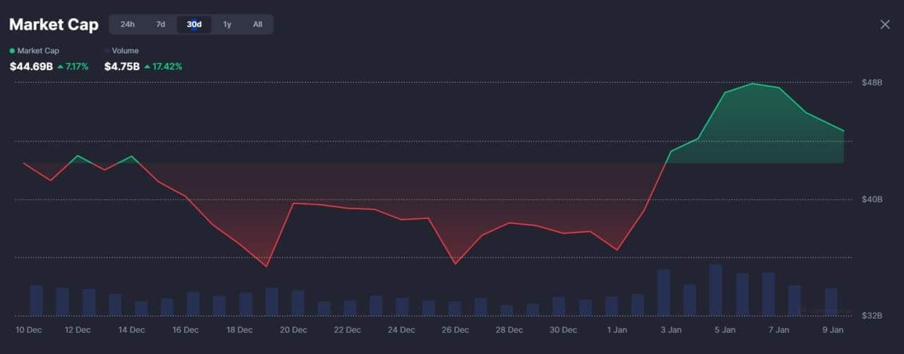 Après plusieurs semaines de calme, le marché des pièces de monnaie-mèmes commence enfin à reprendre vie. Au cours des 30 derniers jours, la dynamique du marché a nettement évolué, les fonds revenant discrètement. À la fin du mois de décembre, la capitalisation boursière totale des pièces de monnaie-mèmes était passée d'environ 42 milliards de dollars à près de 36 milliards de dollars, mais dès le début du mois de janvier, cette tendance s'est inversée, atteignant un sommet proche de 48 milliards de dollars, avant de légèrement reculer à 44,69 milliards de dollars actuellement.