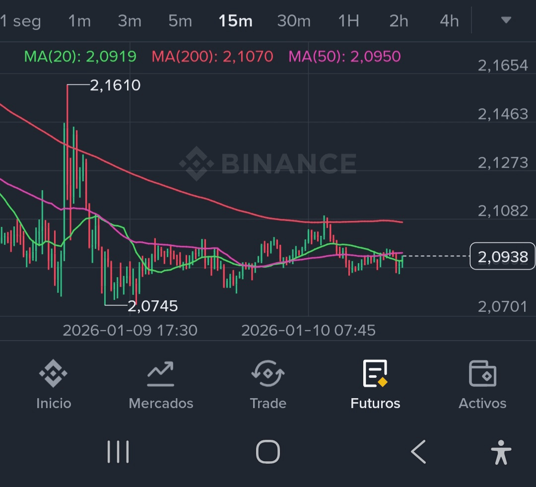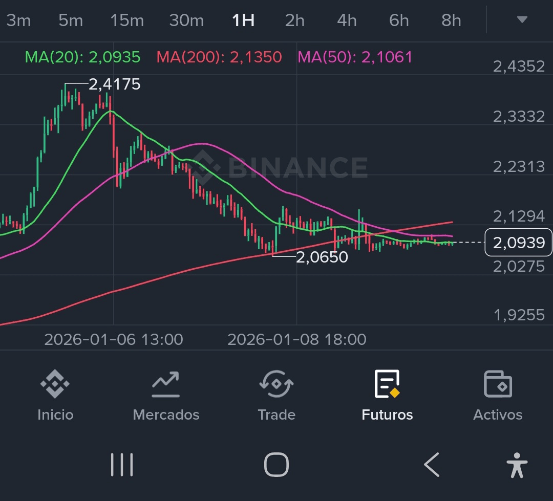 Cependant, sur les cadences moyennes (4H et 1H), l'histoire est différente. Nous avons observé une structure correctrice claire depuis le sommet de 2,4175, perdant progressivement de la force. Actuellement, le prix est « coincé » en lutte contre des résistances dynamiques sur 1H, montrant de l'indécision autour de la zone des 2,09 - 2,10 USDT. Il n'y a pas de direction dominante à court terme ; il s'agit d'un mouvement alterné entre les acheteurs défendant le support et les vendeurs pressant à chaque rebond.