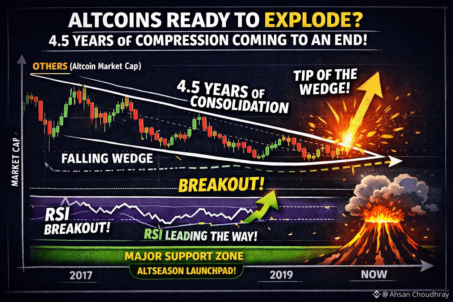 For nearly 4.5 years, altcoins have been compressing inside a huge descending wedge — a structure that has repeatedly rejected price around 2017, 2019, and 2021. Right now, price is pressing against the final edge of that formation. This kind of pressure doesn’t build forever.