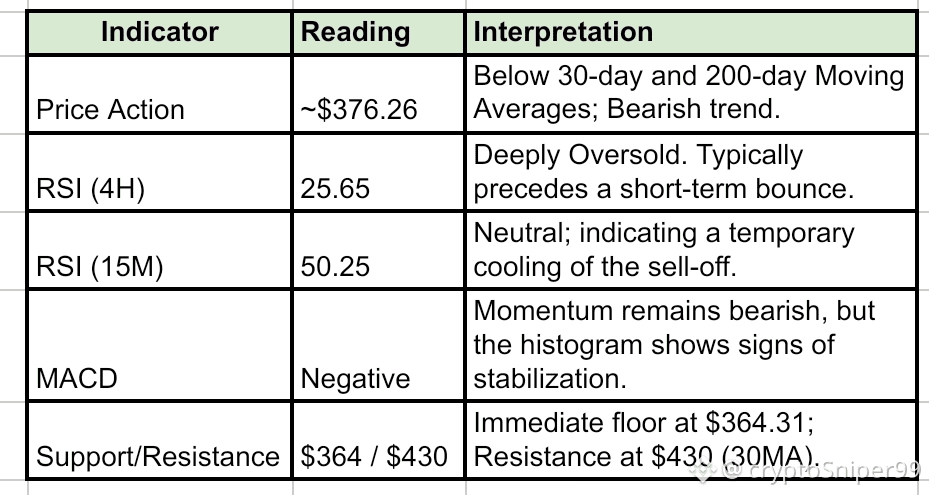 The 4-hour chart reveals a sharp "liquidity flush" down to $364.31. While the long-term trend (200MA) is currently sloping downward, the extremely low RSI (under 30) suggests that the initial "panic selling" may be reaching exhaustion.