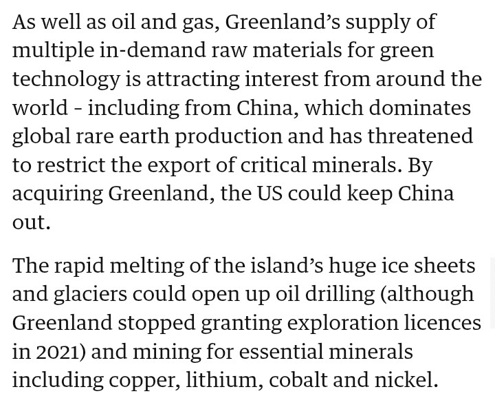 😉😉😉 👆 Et ce n'est pas tout. Pense à la stratégie ! Imagine la position idéale que le Groenland occupe. Ensuite, la Chine et la Russie tentent d'obtenir une part du gâteau aussi ! Le potentiel pétrolier sous la glace ! Les minéraux et éléments rares trouvés dans très peu d'endroits sur la planète.
