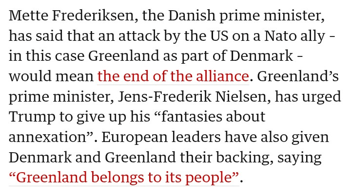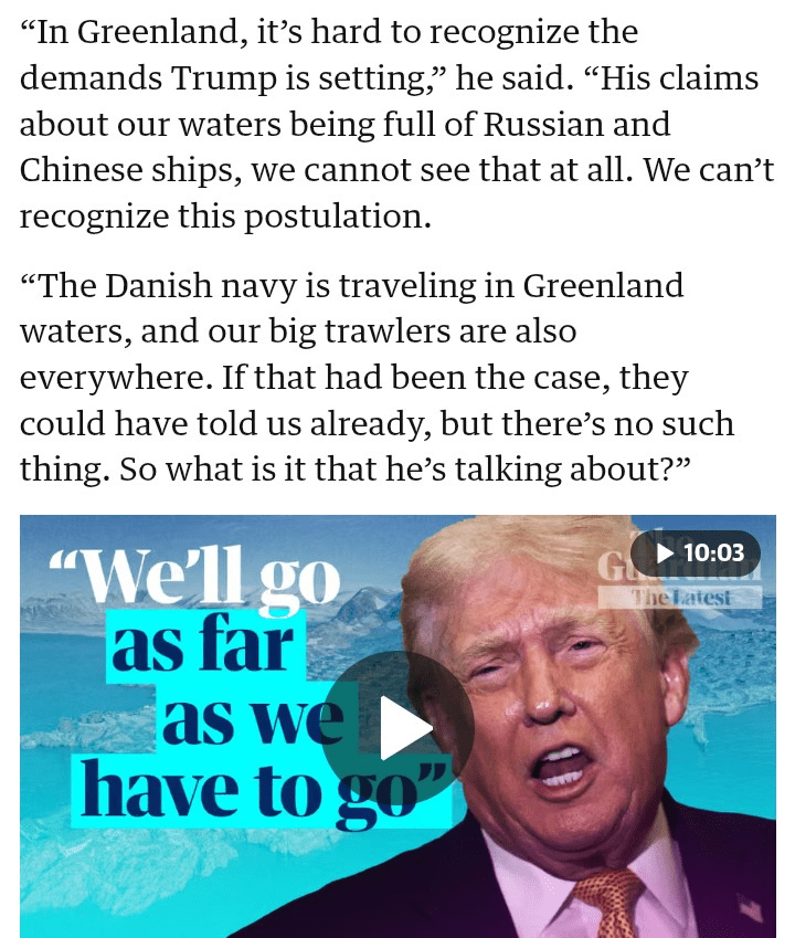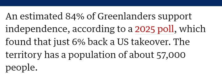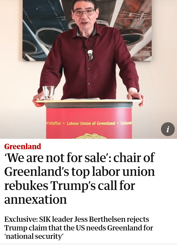 N'oublions pas le timing, tout comme le Venezuela, le Groenland est maintenant le prochain sur la liste. Alors que le Venezuela s'est déroulé différemment et que son peuple a été affaibli pendant des années par la faim et les menaces, cela ne fonctionnera pas ici au Groenland.