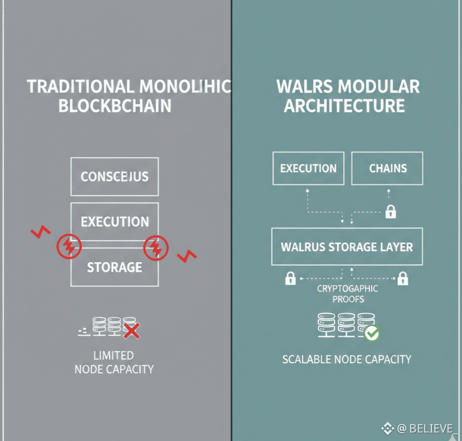 Walrus fundamentally changes the philosophy of blockchain infrastructure to separate storage and consensus execution to allow each system layer to be optimized to its purpose. Monolithic blockchain design (Traditional): Traditional blockchain designs place full history of ledgers in all data types- data categories such as transaction data, smart contract data and unstructured data all stored in limited node capacity. This architecture imposes scalability bottlenecks that can never be overcome in cases where applications need permanent giant datasets. The solution of this is provided by Walrus using positioning storage by module design where data is referenced by blockchain nodes instead of duplication of entire payloads.