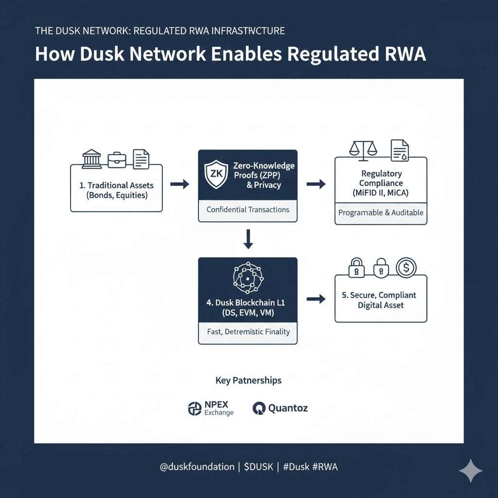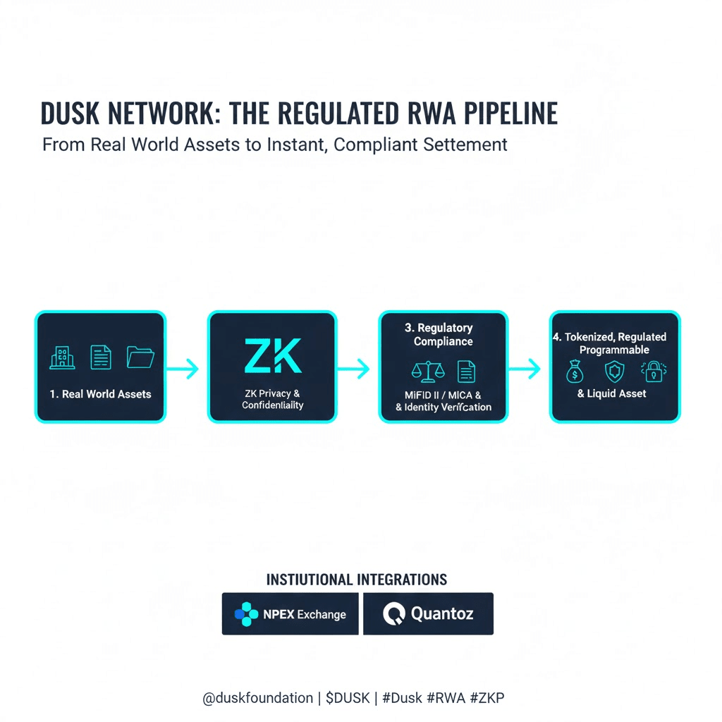 Actifs régulés ➡ Dusk L1 (ZK-Confidentialité) ➡ Finalité instantanée ➡ Conformité mondiale