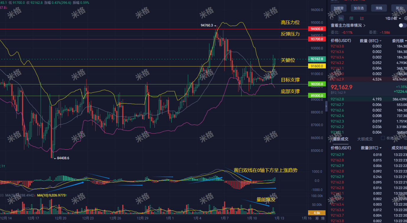 En combinant le « pot aux roses » des informations et la forme offensive technique, mon jugement est le suivant : aujourd'hui, la tendance globale du BTC reste haussière, avec une forte probabilité de viser la zone de résistance 93700-94500. Cependant, le chemin ne sera certainement pas sans obstacles. Le marché testera nécessairement l'intensité des supports, notamment dans la zone 91600-91000, où une lutte intense entre acheteurs et vendeurs s'annonce. La probabilité d'un rebond en V direct est faible, il est plus probable qu'il s'agisse d'une montée progressive après confirmation du support.